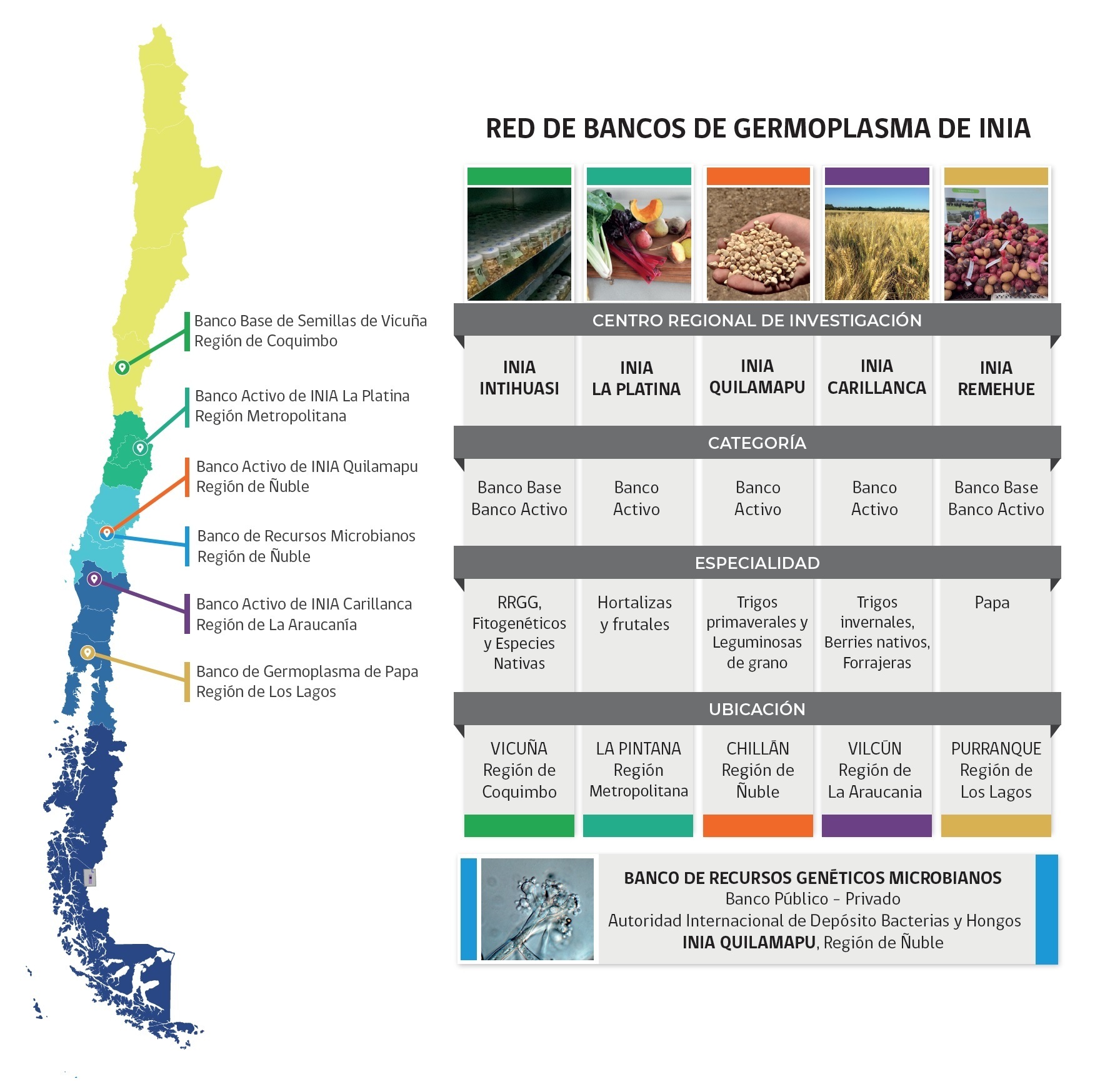 INIA cuenta con una Red de Bancos de Germoplasma donde conserva alrededor de 33.000 accesiones de especies vegetales cultivadas y nativas, además de 4.083 accesiones de microorganismos. De los recursos fitogenéticos, aproximadamente un 91% de las accesiones corresponde a especies cultivadas (51% cereales, 28% leguminosas, 3% hortalizas, 3% forrajeras y 6% a otras especies, entre las que se incluye papas) y un 9% a especies nativas. No obstante, esta última colección es importante, ya que representa el 27% de la flora nativa chilena. En tanto, la colección pública de microorganismos del INIA está conformada principalmente por hongos y bacterias. De éstos, más del 80% tiene potencial para el desarrollo de bioinsumos de impacto en el sector agroalimentario. Del total de la colección, el 61% corresponde a hongos entomopatógenos, 23% a hongos fitopatógenos, 10% a hongos micopatógenos, 3% a hongos nematófagos, 2% a endófitos y 1% a bacterias.